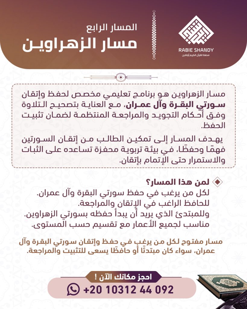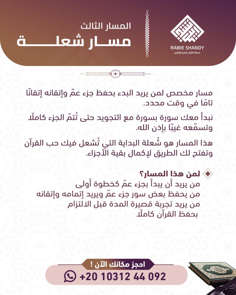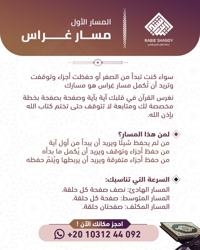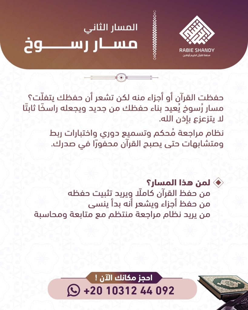 برنامج متكامل لتحفيظ القرآن للأطفال والكبار، يعتمد على خطة مرنة تناسب مستوى كل طالب، مع مراجعة مستمرة لضمان تثبيت الحفظ